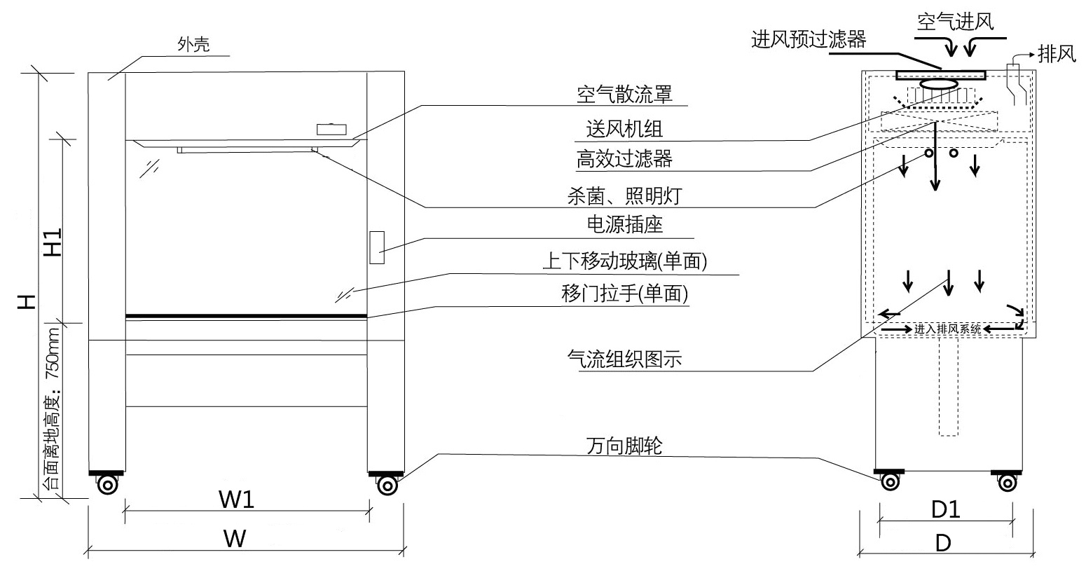 凈化工作臺(tái)由箱體、風(fēng)機(jī)、高效過(guò)濾器、操作開關(guān)等幾大部件組成。箱體采用彩鋼板等制作,表面噴塑處理,工作臺(tái)面采用不銹鋼制作。凈化單元采用了可調(diào)風(fēng)量的風(fēng)機(jī)系統(tǒng),通過(guò)調(diào)節(jié)風(fēng)機(jī)的工作狀態(tài),可使?jié)崈艄ぷ鲄^(qū)中的平均風(fēng)速保持額定范圍內(nèi),而且有效地延長(zhǎng)了高效過(guò)濾器使用壽命。